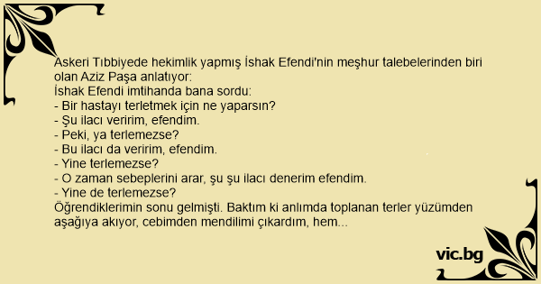 Askeri Tıbbiyede hekimlik yapmış İshak Efendi'nin meşhur talebelerinden biri olan Aziz Paşa anlatıyor: