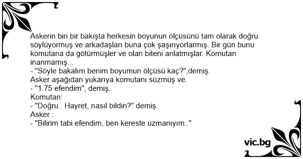 Askerin biri bir bakışta herkesin boyunun ölçüsünü tam olarak doğru söylüyormuş ve arkadaşları buna çok şaşırıyorlarmış. Bir gün bunu komutana da götürmüşler ve olan biteni anlatmışlar. Komutan inanmamış...