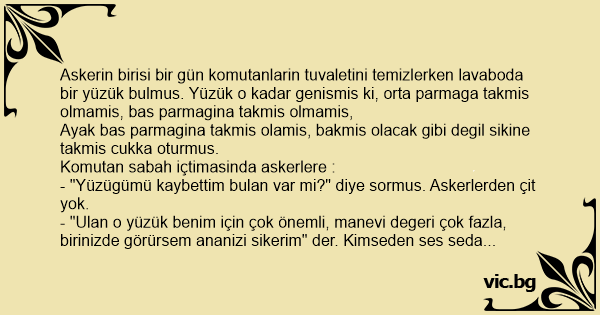 - "Tabi!,ben yüzük kaybetmisim kimin sikindee" der. Hemen o sirada bizim asker atilir bagirarak: