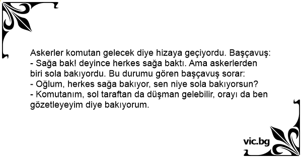 - Sağa bak! deyince herkes sağa baktı. Ama askerlerden biri sola bakıyordu. Bu durumu gören başçavuş sorar: