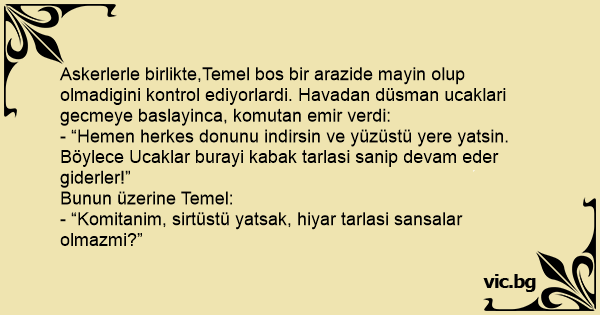 Askerlerle birlikte,Temel bos bir arazide mayin olup olmadigini kontrol ediyorlardi. Havadan düsman ucaklari gecmeye baslayinca, komutan emir verdi: