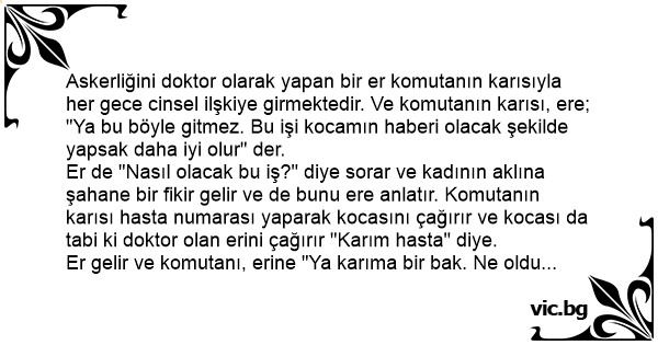 Er gelir ve komutanı, erine "Ya karıma bir bak. Ne oldu acaba, çok hasta galiba" der. Er de karısına bakar ve "Komutanım, karınız çok hasta" der. Komutanı " Ne oldu oğlum, ne var" diye sorar.