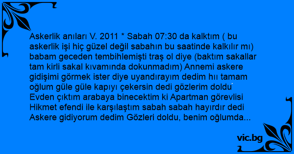 Askerlik anıları V. 2011 * Sabah 07:30 da kalktım ( bu askerlik işi hiç güzel değil sabahın bu saatinde kalkılır mı) babam geceden tembihlemişti traş ol diye (baktım sakallar tam kirli sakal kıvamında dokunmadım) Annemi askere gidişimi görmek ister diye uyandırayım dedim hıı tamam oğlum güle güle kapıyı çekersin dedi gözlerim doldu