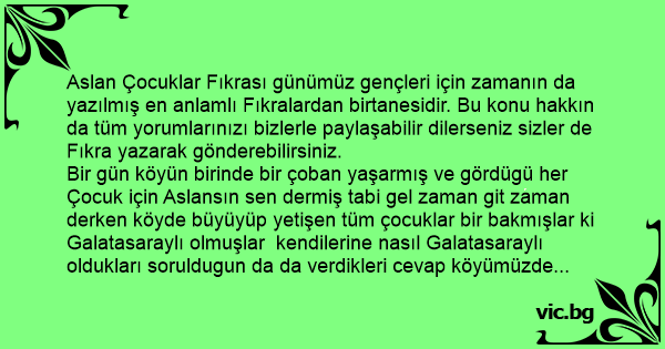 Aslan Çocuklar Fıkrası günümüz gençleri için zamanın da yazılmış en anlamlı Fıkralardan birtanesidir. Bu konu hakkın da tüm yorumlarınızı bizlerle paylaşabilir dilerseniz sizler de Fıkra yazarak gönderebilirsiniz.