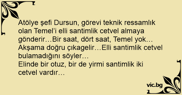 Atölye şefi Dursun, görevi teknik ressamlık olan Temel’i elli santimlik cetvel almaya gönderir…Bir saat, dört saat, Temel yok…