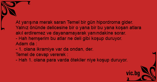 At yarışına merak saran Temel bir gün hipordroma gider. Yalnız önünde delicesine bir o yana bir bu yana koşan atlara akıl erdiremez ve dayanamayarak yanındakine sorar.