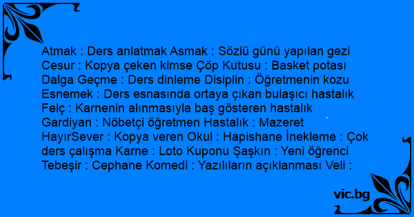 Atmak : Ders anlatmak Asmak : Sözlü günü yapılan gezi Cesur : Kopya çeken kimse Çöp Kutusu : Basket potası Dalga Geçme : Ders dinleme Disiplin : Öğretmenin kozu Esnemek : Ders esnasında ortaya çıkan bulaşıcı hastalık Felç : Karnenin alınmasıyla baş gösteren hastalık Gardiyan : Nöbetçi öğretmen Hastalık : Mazeret HayırSever : Kopya veren Okul : Hapishane İnekleme : Çok ders çalışma Karne : Loto Kuponu Şaşkın : Yeni öğrenci Tebeşir : Cephane Komedi : Yazılıların açıklanması Veli : Ara karneden bile haberi olmayan gariban Çıkış Zili : Can kurtaran Sözlü : Ecel teri, mizan terazisi Not Defteri : Loto kağıdı Öğrenci : Hilkat garibesi, zavallı Öğretmen : Ahiret sualcisi Sınıf : Muhabbethane Ödev : Angarya Sınıf Geçmek : Tahayyül Sınıfta Kalmak : Küme düşmek Teneffüs : Kudurma saati Giriş Zili : Cenaze marşı Masal : Anlatılan ders Enflasyon : Notların öğretmen tarafından düşürülmesi Devalüasyon : Öğretmenlerin kolay sorarak başarı oranını yükseltmeleri Vaka-ı Vakvak : İyi bekleyip düşük alan öğrencilerin sözleri İstenmeyen Gün : Pazartesi İstenen Gün : Cuma En İyi Haber : Hoca Yok, ders boş, vallaha.