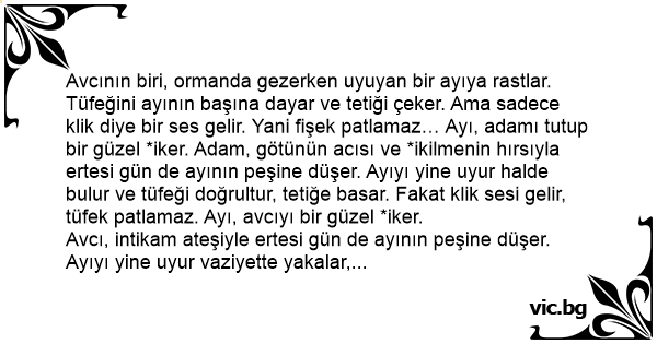Avcının biri, ormanda gezerken uyuyan bir ayıya rastlar. Tüfeğini ayının başına dayar ve tetiği çeker. Ama sadece klik diye bir ses gelir. Yani fişek patlamaz… Ayı, adamı tutup bir güzel *iker. Adam, götünün acısı ve *ikilmenin hırsıyla ertesi gün de ayının peşine düşer. Ayıyı yine uyur halde bulur ve tüfeği doğrultur, tetiğe basar. Fakat klik sesi gelir, tüfek patlamaz. Ayı, avcıyı bir güzel *iker.