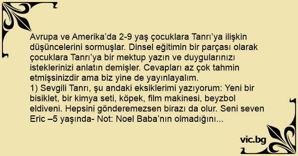 1) Sevgili Tanrı, şu andaki eksiklerimi yazıyorum: Yeni bir bisiklet, bir kimya seti, köpek, film makinesi, beyzbol eldiveni. Hepsini gönderemezsen birazı da olur. Seni seven Eric –5 yaşında- Not: Noel Baba’nın olmadığını biliyorum.