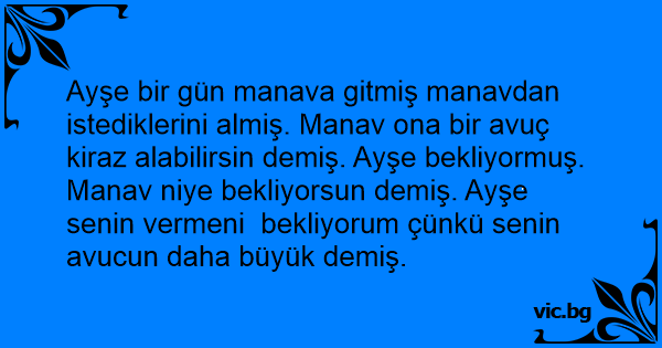 Ayşe bir gün manava gitmiş manavdan istediklerini almiş. Manav ona bir avuç kiraz alabilirsin demiş. Ayşe bekliyormuş. Manav niye bekliyorsun demiş. Ayşe senin vermeni bekliyorum çünkü senin avucun daha büyük demiş.