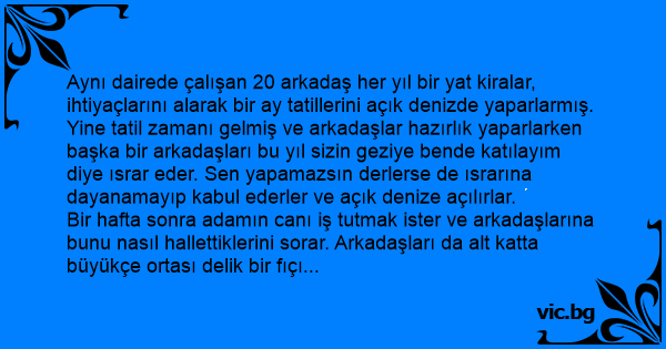 Aynı dairede çalışan 20 arkadaş her yıl bir yat kiralar, ihtiyaçlarını alarak bir ay tatillerini açık denizde yaparlarmış. Yine tatil zamanı gelmiş ve arkadaşlar hazırlık yaparlarken başka bir arkadaşları bu yıl sizin geziye bende katılayım diye ısrar eder. Sen yapamazsın derlerse de ısrarına dayanamayıp kabul ederler ve açık denize açılırlar.