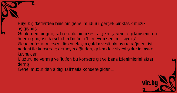 Genel müdür bu eseri dinlemek için çok hevesli olmasına rağmen, işi nedeni ile,konsere gidemeyeceğinden, gelen davetiyeyi şirketin insan kaynakları