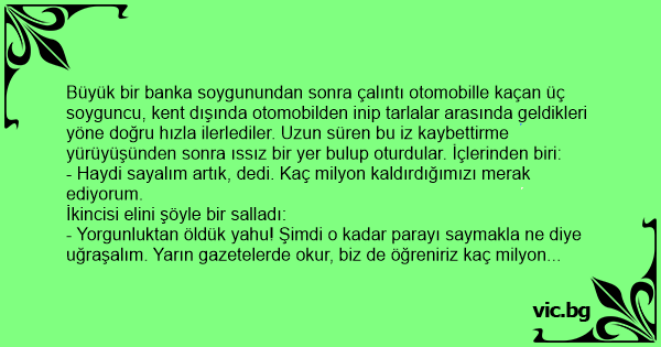 - Yorgunluktan öldük yahu! Şimdi o kadar parayı saymakla ne diye uğraşalım. Yarın gazetelerde okur, biz de öğreniriz kaç milyon kaldırdığımızı.