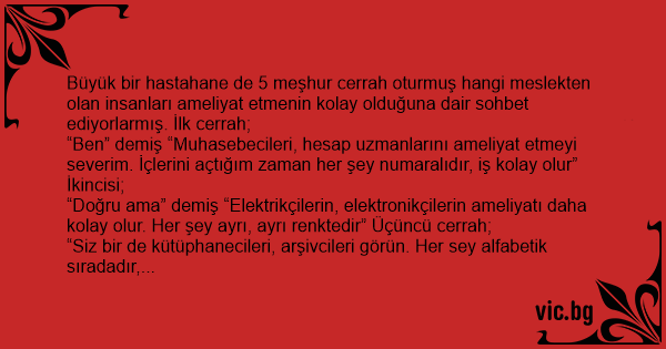 Büyük bir hastahane de 5 meşhur cerrah oturmuş hangi meslekten olan insanları ameliyat etmenin kolay olduğuna dair sohbet ediyorlarmış. İlk cerrah;