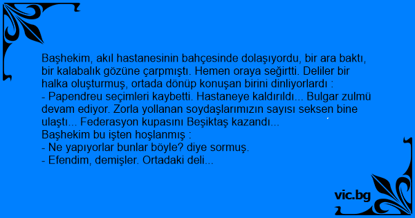 Başhekim, akıl hastanesinin bahçesinde dolaşıyordu, bir ara baktı, bir kalabalık gözüne çarpmıştı. Hemen oraya seğirtti. Deliler bir halka oluşturmuş, ortada dönüp konuşan birini dinliyorlardı :