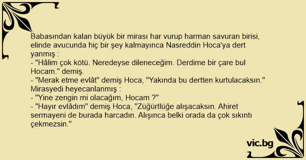 - "Merak etme evlât" demiş Hoca, "Yakında bu dertten kurtulacaksın." Mirasyedi heyecanlanmış :