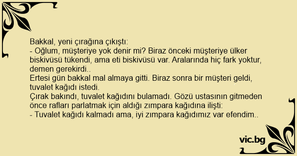 Ertesi gün bakkal mal almaya gitti. Biraz sonra bir müşteri geldi, tuvalet kağıdı istedi.