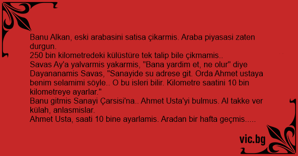 Savas Ay'a yalvarmis yakarmis, "Bana yardim et, ne olur" diye Dayananamis Savas, "Sanayide su adrese giт. Orda Ahmet ustaya benim selamimi söyle.. O bu isleri bilir. Kilometre saatini 10 bin kilometreye ayarlar."
