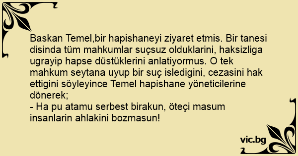 Baskan Temel,bir hapishaneyi ziyaret etmis. Bir tanesi disinda tüm mahkumlar suçsuz olduklarini, haksizliga ugrayip hapse düstüklerini anlatiyormus. O tek mahkum seytana uyup bir suç isledigini, cezasini hak ettigini söyleyince Temel hapishane yöneticilerine dönerek;