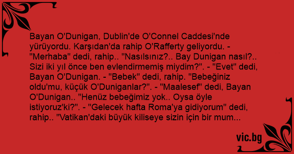 Bayan O'Dunigan, Dublin'de O'Connel Caddesi'nde yürüyordu. Karşıdan'da rahip O'Rafferty geliyordu. - "Merhaba" dedi, rahip.. "Nasılsınız?.. Bay Dunigan nasıl?.. Sizi iki yıl önce ben evlendirmemiş miydim?". - "Evet" dedi, Bayan O'Dunigan. - "Bebek" dedi, rahip. "Bebeğiniz oldu'mu, küçük O'Duniganlar?". - "Maalesef" dedi, Bayan O'Dunigan.. "Henüz bebeğimiz yok.. Oysa öyle istiyoruz'ki?". - "Gelecek hafta Roma'ya gidiyorum" dedi, rahip.. "Vatikan'daki büyük kiliseye sizin için bir mum dikeceğim". - "Teşekkürler sevgili rahip" diye adamın ellerini öptü kadın. - "Size minnettar olacağız". Birkaç yıl geçti aradan.. Kadınla rahip bir daha karşılaştılar.. Rahip merakla sordu; - "Bebeğiniz oldu'mu peki?". - "Oldu" dedi, kadın.. "Sekiz yılda üç ikiz, dört'de tek doğurdum. 10 çocuğumuz var". - "Harika" dedi Rahip.. "Harika.. Mucize işte bu.. Peki, o şirin kocanız ne yapıyor?". - "Roma'ya gitti, dedi kadın.. "Sizin o Allah'ın belası mumunuzu üflemeye"...