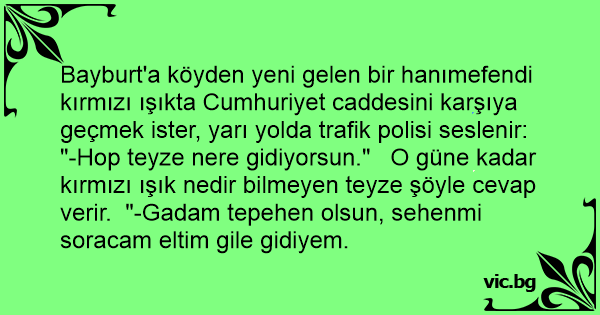 Bayburt'a köyden yeni gelen bir hanımefendi kırmızı ışıkta Cumhuriyet caddesini karşıya geçmek ister, yarı yolda trafik polisi seslenir: "-Hop teyze nere gidiyorsun." O güne kadar kırmızı ışık nedir bilmeyen teyze şöyle cevap verir. "-Gadam tepehen olsun, sehenmi soracam eltim gile gidiyem.