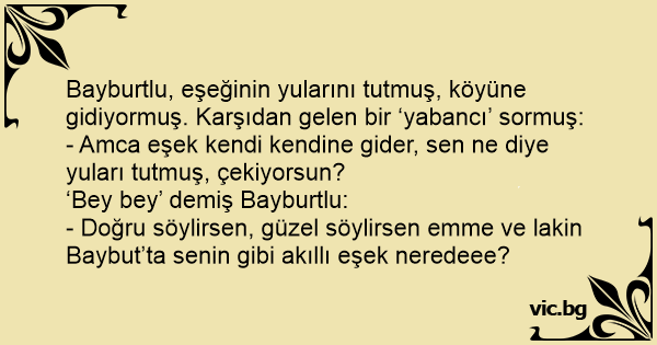 Bayburtlu, eşeğinin yularını tutmuş, köyüne gidiyormuş. Karşıdan gelen bir ‘yabancı’ sormuş: