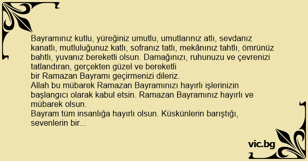 Bayramınız kutlu, yüreğiniz umutlu, umutlarınız atlı, sevdanız kanatlı, mutluluğunuz katlı, sofranız tatlı, mekânınız tahtlı, ömrünüz bahtlı, yuvanız bereketli olsun. Damağınızı, ruhunuzu ve çevrenizi tatlandıran, gerçekten güzel ve bereketli bir Ramazan Bayramı geçirmenizi dileriz.