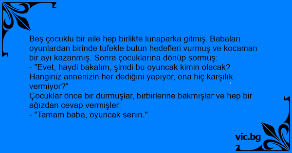 Beş çocuklu bir aile hep birlikte lunaparka gitmiş. Babaları oyunlardan birinde tüfekle bütün hedefleri vurmuş ve kocaman bir ayı kazanmış. Sonra çocuklarına dönüp sormuş: