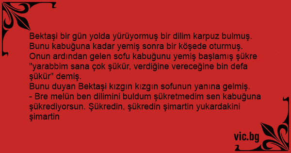 Bektaşi bir gün yolda yürüyormuş bir dilim karpuz bulmuş. Bunu kabuğuna kadar yemiş sonra bir köşede oturmuş. Onun ardından gelen sofu kabuğunu yemiş başlamış şükre "yarabbim sana çok şükür, verdiğine vereceğine bin defa şükür" demiş.
