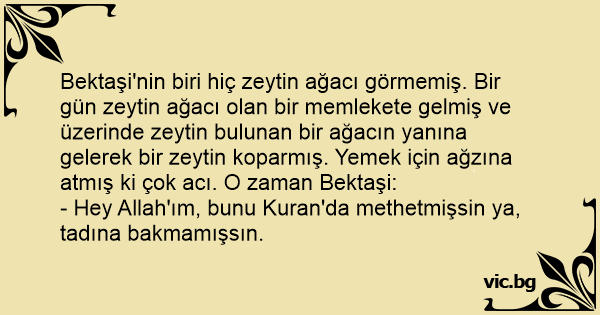 Bektaşi'nin biri hiç zeytin ağacı görmemiş. Bir gün zeytin ağacı olan bir memlekete gelmiş ve üzerinde zeytin bulunan bir ağacın yanına gelerek bir zeytin koparmış. Yemek için ağzına atmış ki çok acı. O zaman Bektaşi: