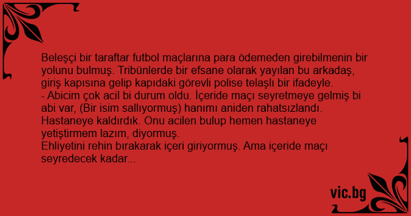 Beleşçi bir taraftar futbol maçlarına para ödemeden girebilmenin bir yolunu bulmuş. Tribünlerde bir efsane olarak yayılan bu arkadaş, giriş kapısına gelip kapıdaki görevli polise telaşlı bir ifadeyle.