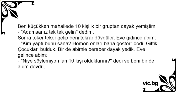 - "Kim yaptı bunu sana? Hemen onları bana göster" dedi. Gittik. Çocukları bulduk. Bir de abimle beraber dayak yedik. Eve gelince abim: