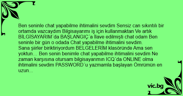 Ben seninle chat yapabilme ihtimalini sevdim Sensiz can sıkıntılı bir ortamda vazcaydım Bilgisayarımı iş için kullanmaktan Ve artık BİLGİSAYARIM´da BAŞLANGIÇ´a İlave edilmişti chat odam Ben seninle bir gün o odada Chat yapabilme ihtimalini sevdim.