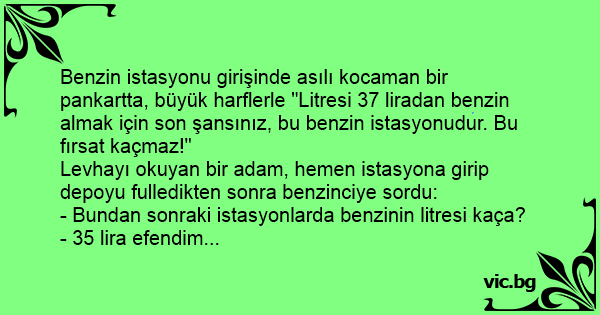 Benzin istasyonu girişinde asılı kocaman bir pankartta, büyük harflerle "Litresi 37 liradan benzin almak için son şansınız, bu benzin istasyonudur. Bu fırsat kaçmaz!"
