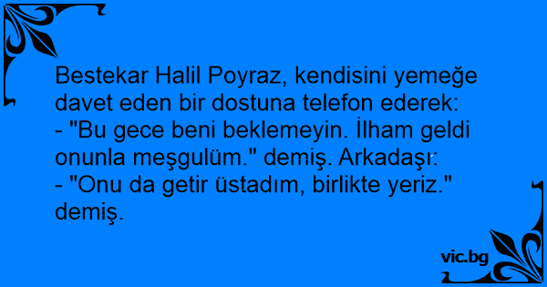 - "Bu gece beni beklemeyin. İlham geldi onunla meşgulüm." demiş. Arkadaşı: