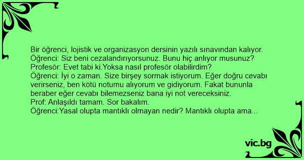 Öğrenci: İyi o zaman. Size birşey sormak istiyorum. Eğer doğru cevabı verirseniz, ben kötü notumu alıyorum ve gidiyorum. Fakat bununla beraber eğer cevabı bilemezseniz bana iyi not vereceksiniz.