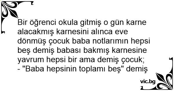 Bir öğrenci okula gitmiş o gün karne alacakmış karnesini alınca eve dönmüş çocuk baba notlarımın hepsi beş demiş babası bakmış karnesine yavrum hepsi bir ama demiş çocuk;