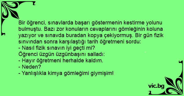 Bir öğrenci, sınavlarda başarı göstermenin kestirme yolunu bulmuştu. Bazı zor konuların cevaplarını gömleğinin koluna yazıyor ve sınavda buradan kopya çekiyormuş. Bir gün fizik sınvından sonra karşılaştığı tarih öğretmeni sordu: