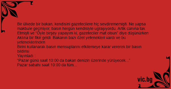 Toplandilar... Bakan geldi ve elinde bastonuyla denizin üzerinde yürümeye başladı ve karşı kıyıya kadar da yürüyerek ilerledi... Herkesin gözleri dehşetle açılmıştı. Fakat ertesi günü tüm gazetelerde şu başlık okundu :