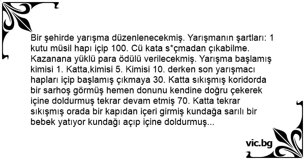Bir şehirde yarışma düzenlenecekmiş. Yarışmanın şartları: 1 kutu müsil hapı içip 100. Cü kata s*çmadan çıkabilme. Kazanana yüklü para ödülü verilecekmiş. Yarışma başlamış kimisi 1. Katta,kimisi 5. Kimisi 10. derken son yarışmacı hapları içip başlamış çıkmaya 30. Katta sıkışmış koridorda bir sarhoş görmüş hemen donunu kendine doğru çekerek içine doldurmuş tekrar devam etmiş 70. Katta tekrar sıkışmış orada bir kapıdan içeri girmiş kundağa sarılı bir bebek yatıyor kundağı açıp içine doldurmuş tekrar devam etmiş 99. Kata gelmiş sıkışmış gene bir kapıyı zorlamış içerde masanın üstünde bir rahibe elbisesi hemen içine doldurup camdan aşağıya atmış ve yüzüncü kata çıkıp yarışmayı kazanır. Para ödülünü aldıktan sonra 5 yıldızlı bir otele tatile gider. Güneşlenirken gazetelere göz gezdirirken haberleri okur. Dünyada ilk defa bir sarhoş donu ile kilodu arasına s*çmayı başardı. İki kiloluk bir bebek 3 kilo b*k s*çtı.99. Kattan atlayan rahibe b*k oldu.