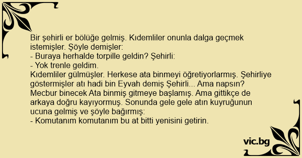 Kıdemliler gülmüşler. Herkese ata binmeyi öğretiyorlarmış. Şehirliye göstermişler atı hadi bin Eyvah demiş Şehirli... Ama napsın? Mecbur binecek Ata binmiş gitmeye başlamış. Ama gittikçe de arkaya doğru kayıyormuş. Sonunda gele gele atın kuyruğunun ucuna gelmiş ve şöyle bağırmış: