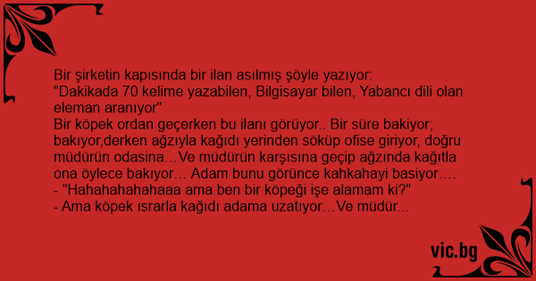 Bir köpek ordan geçerken bu ilanı görüyor.. Bir süre bakiyor; bakıyor,derken ağzıyla kağıdı yerinden söküp ofise giriyor, doğru müdürün odasina…Ve müdürün karşısına geçip ağzında kağıtla ona öylece bakıyor… Adam bunu görünce kahkahayi basiyor….