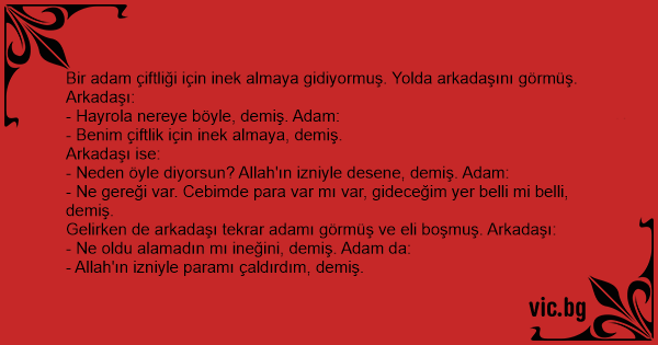 Bir adam çiftliği için inek almaya gidiyormuş. Yolda arkadaşını görmüş. Arkadaşı: