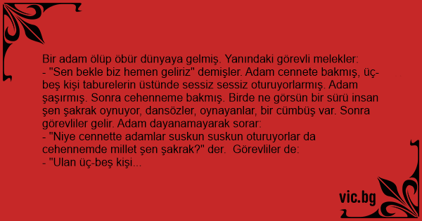 - "Sen bekle biz hemen geliriz" demişler. Adam cennete bakmış, üç-beş kişi taburelerin üstünde sessiz sessiz oturuyorlarmış. Adam şaşırmış. Sonra cehenneme bakmış. Birde ne görsün bir sürü insan şen şakrak oynuyor, dansözler, oynayanlar, bir cümbüş var. Sonra görevliler gelir. Adam dayanamayarak sorar: