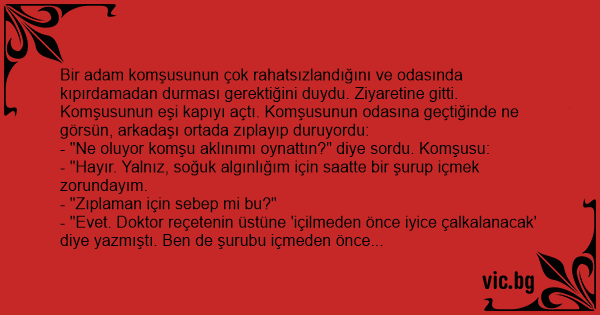 Bir adam komşusunun çok rahatsızlandığını ve odasında kıpırdamadan durması gerektiğini duydu. Ziyaretine gitti. Komşusunun eşi kapıyı açtı. Komşusunun odasına geçtiğinde ne görsün, arkadaşı ortada zıplayıp duruyordu:
