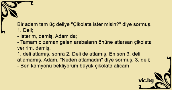 1. deli atlamış, sonra 2. Deli de atlamış. En son 3. deli atlamamış. Adam. "Neden atlamadın" diye sormuş. 3. deli;