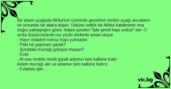 Bir adam uçağıyla Afrika'nın üzerinde gezerken birden uçağı arızalanır ve ormanlık bir alana düşer. Üstüne üstlük bir Afrika kabilesinin ona doğru yaklaştığını görür. Adam içinden "İşte şimdi hapı yuttuk" der. O anda düşüncesinde nur yüzlü dedenin sesini duyar.