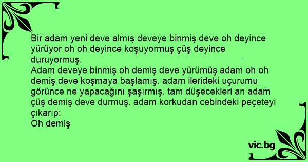 Adam deveye binmiş oh demiş deve yürümüş adam oh oh demiş deve koşmaya başlamış. adam ilerideki uçurumu görünce ne yapacağını şaşırmış. tam düşecekleri an adam çüş demiş deve durmuş. adam korkudan cebindeki peçeteyi çıkarıp: