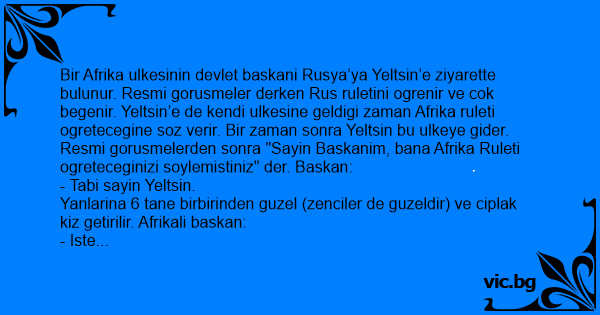 Bir Afrika ulkesinin devlet baskani Rusya’ya Yeltsin’e ziyarette bulunur. Resmi gorusmeler derken Rus ruletini ogrenir ve сок begenir. Yeltsin’e de kendi ulkesine geldigi zaman Afrika ruleti ogretecegine soz verir. Bir zaman sonra Yeltsin bu ulkeye gider.