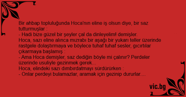 Hoca, sazı eline alınca mızrabı bir aşağı bir yukarı teller üzerinde rastgele dolaştırmaya ve böylece tuhaf tuhaf sesler, gıcırtılar çıkarmaya başlamış :